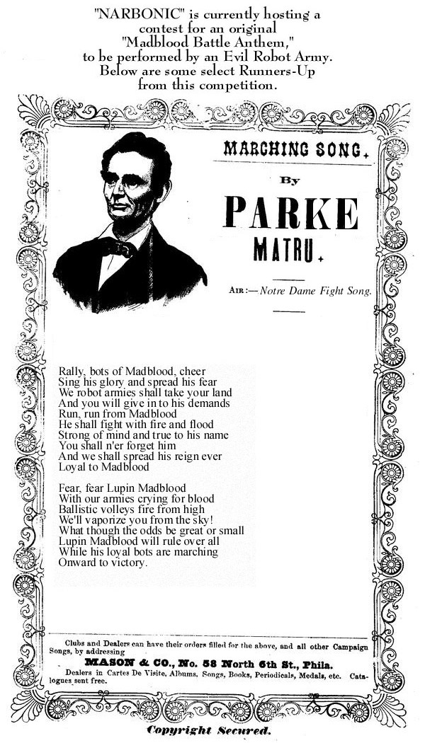 Now this is a natural choice for a robot battle anthem tune. For the purposes of the strip, I favored original tunes over parodies in the contest, but I did like seeing which tunes people selected to riff on. I’m similarly awed and baffled by the various filks going on in the Narbonic and Skin Horse comments these days. I’ve long given up on trying to understand anything my comics inspire.