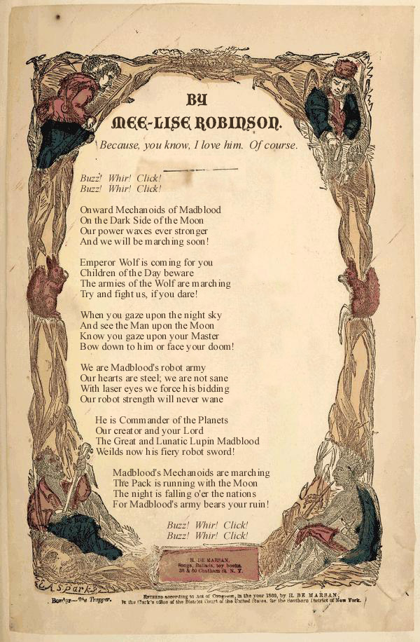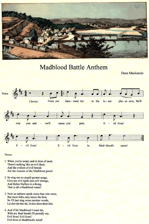 Excuse me, but how great was Dana for writing out musical notation for this anthem? Pretty great, that’s all I can say. It was delightful to see what language people came up with to pay tribute to Madblood’s genius, and “Helen Narbon in a thong” ranks high among my favorite examples.