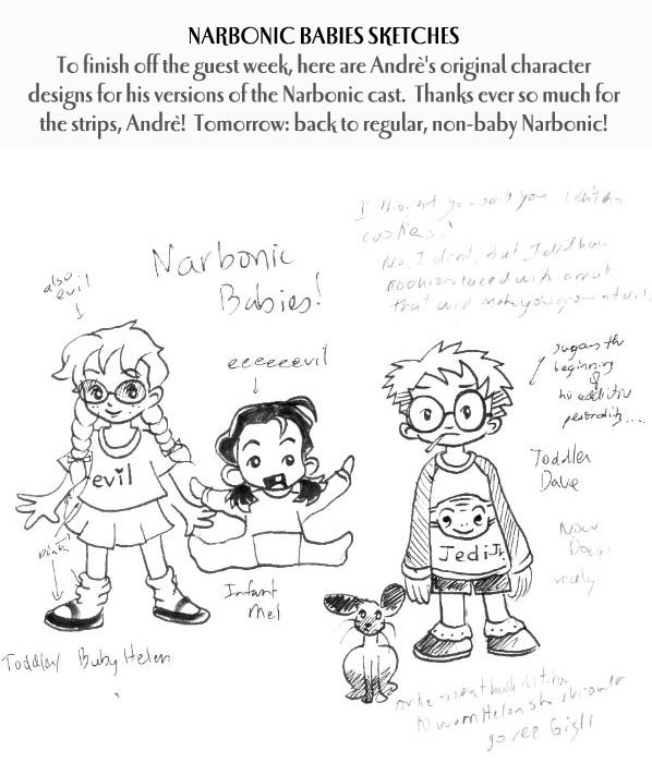This is actually not the end of the Narbonic Babies. Andre drew an additional wrap-up strip, which I ended up running the Sunday after this. In the meantime, please enjoy these adorable drawings. Some cartoonists are really good at drawing kids, and some cartoonists are really bad at it, and there seems to be no middle ground; you either get it or you don’t. Andre draws great kids, and also great cute stuff in general. So thanks again, Andre!