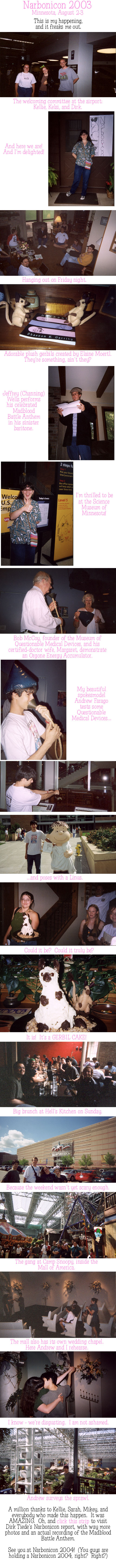 Narbonicon was the work of some very nice people in Minnesota who decided they wanted to fly me there to hang out with them. Andrew went with me because of the admittedly high possibility that this was some kind of “Misery” thing. But it wasn’t! It was a lot of fun, and we ended up doing it not only in 2004, but every year until Narbonic ended. I got to meet a lot of great people, including my current Skin Horse collaborator Jeffrey Wells. The link to Dirk’s site no longer seems to work, alas, but rest assured it was a time.