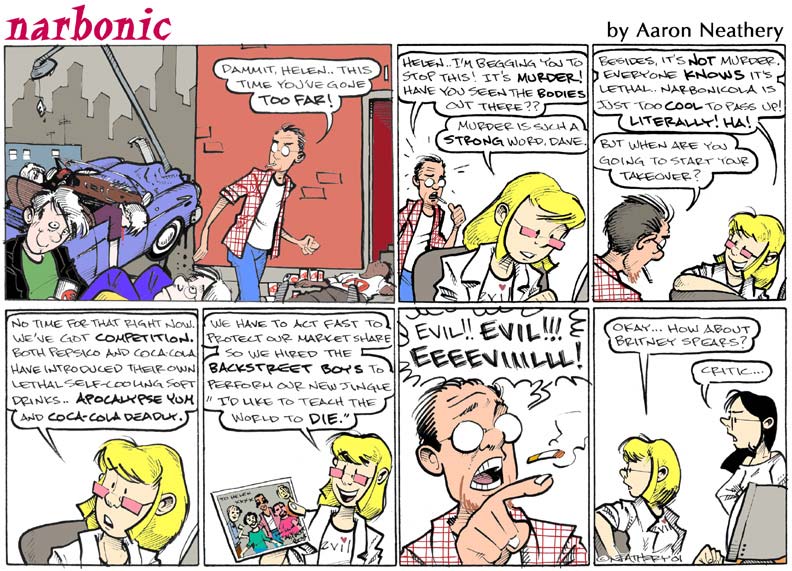 EVIL!!  EVIL!!!  EEEEVIIILLL!  Dave’s attraction to Helen is cut short as the bodies accumulate.  In the original month-long Albert outline, this kind of carnage would have gradually been built up to.  The question of whether or not it’s actually murder to sell a lethal product as long as you openly announce that it’s lethal is underscored by the cigarette hanging out of Dave’s mouth.  However, by her own terms, Helen has committed at least one definite murder by this point: the consumer in strip five.  Ah, well.