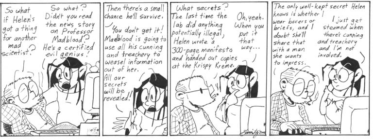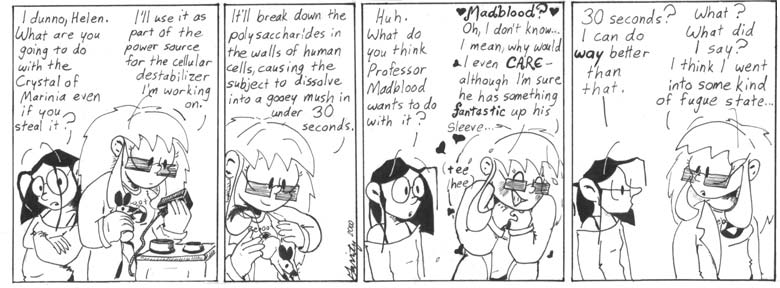 Helen’s shirt sports the logo from the 1990s CGI cartoon “Reboot.” I was watching a lot of “Reboot” at the time because my roommate had every episode on tape. I’d play it while I drew Narbonic. It was actually a pretty good show, especially in the later seasons after the kid characters grew up and became disturbingly hot.