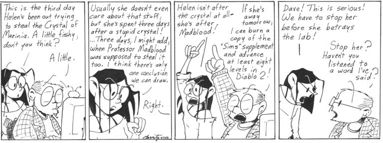 Okay, I pulled the original art for this strip to find out what the small text on the envelope on the first panel says. It’s addressed to Dave Davenport, and the return address reads, “DaveCon 2001.” MAJOR INVISIBLE FORESHADOWING!