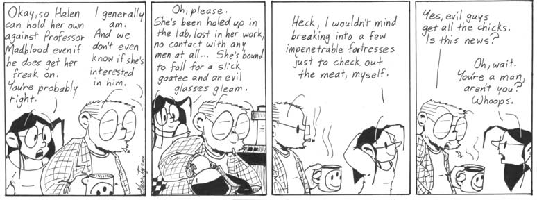 I’m still pretty fond of this strip, so I don’t have anything too snarky to say about it. The characters are developing distinctive voices, and they’re drinking coffee, and that’s what a good Narbonic strip is all about.