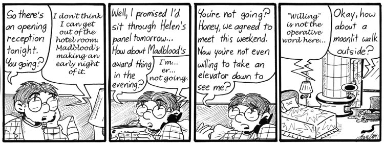 I could be alone here, but the man in the bottom-middle of Thursday’s first panel looks an awful lot like Cheyenne Wright and/or the King of the Silver Lands, from Girl Genius. (Which is odd, because as far as I know he (or they) wasn’t depicted in the comic until ’07, and non-GG depictions of the real person don’t look like this cameo.)