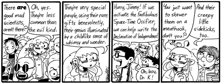 I don’t remember who the all characters in the first panel are–a little help, please?–but the guy in the third panel looks a lot like my friend Jason Shiga, the maddest real-life mad genius I know. Dr. K. is, if I remember correctly, the scientist in Shiga’s comic Meanwhile, and “Jimmy” is the standard name he uses for most of his protagonists.