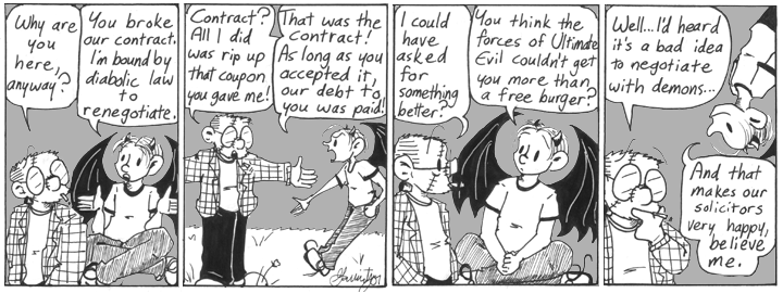 Silly demon! You never just tell the supplicant what the catch is! I mean, really. Every character in this webcomic is a klutz.