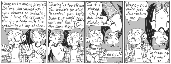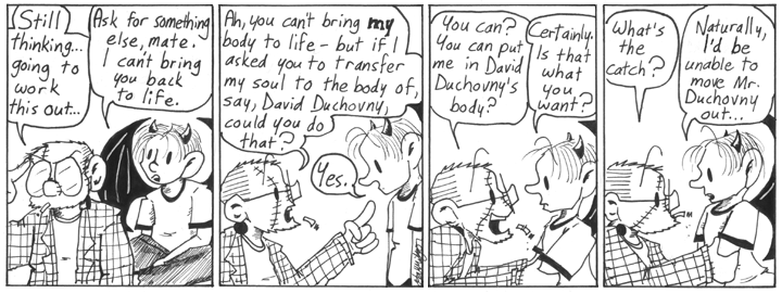 This week of strips gets into some weird territory, is all I can say. I like to think that Dave wants to possess David Duchovny so he can keep his sweet Dave Conspiracy privileges.