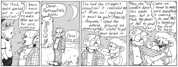 By the way, today’s strip implies that, up to the Madness arc, Dave’s brain remains in its present dead-and-regalvanized state, though the rest of him is alive. I’ve always wondered if Helen actually used the brain scanning technology to move Dave’s mind into the new clone’s living brain.