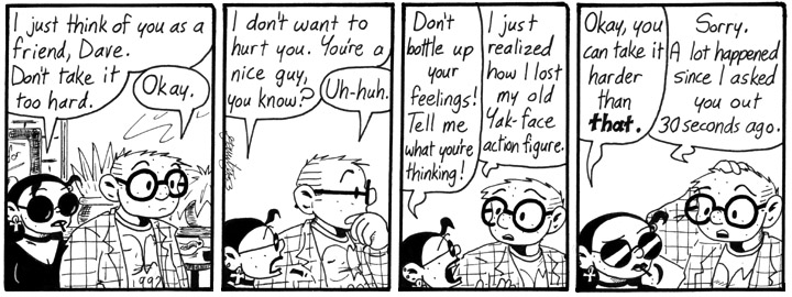 This is the crux of the story for me: Dave learning to see Majel as a person rather than whatever she represents in his mind. I find him adorably dorky in these strips, incidentally.