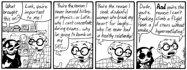 One of the posters in the first panel is for the King Dapper Combo, a junkabilly band I followed avidly in high school. I was not a cool teenager. Another poster is for Sunstorm, a band that Andrew’s friend Blake was in at around the time I drew this strip.