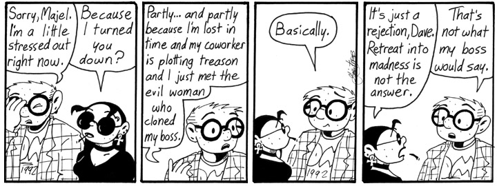 Majel and Teen Dave are picking up the conversation from the end of this week of strips, which ran almost two months earlier. I do love that.