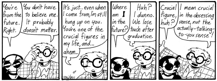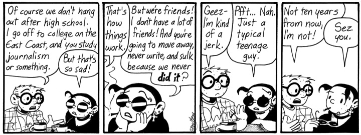 The idea of drifting apart from old friends must bother me a lot, because it comes up a lot in my comics, most ambitiously in this Li’l Mell storyline. My family moved a lot when I was a kid, and then I went to college a long way from home, and after that I moved to the other end of the country for work. I’ve got neglected friends all over the place. Instead of keeping in touch with them, I feel guilty and write sad little comics.