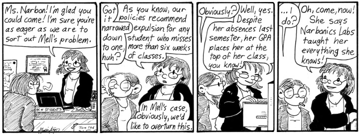 As mentioned way back in the early days of the strip, Helen is “Ms. Narbon” rather than “Dr. Narbon” because she never finished her doctorate. She went mad instead.