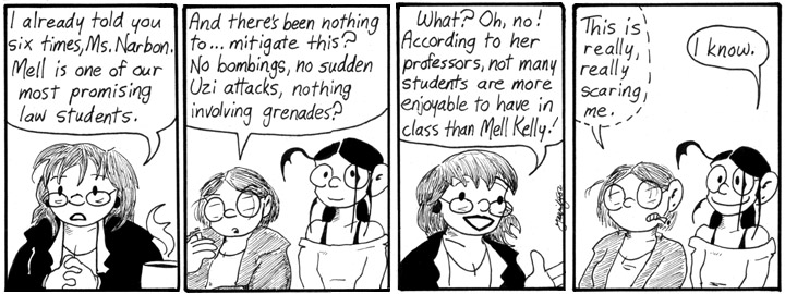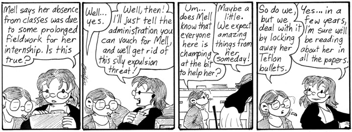 As I mentioned before, the Dean of Students is kind of vaguely based on Lea Hernandez. At the time I drew these strips, Lea was putting together Girlamatic.com, to which I contributed (and continue to contribute) the weekly comic Li’l Mell. I also cast Lea as Mrs. Divine, the principal of the elementary school, in Li’l Mell. More on Li’l Mell later.