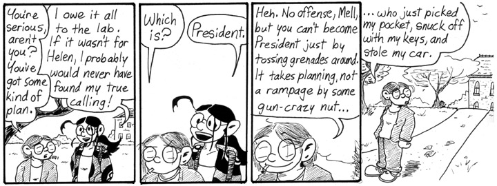 3. It’s funny how you agonize over perfectly fine cartooning. I think you need to give your past self a break: she did a good enough job to win (relative) fame and fortune at the time, so who cares if the left side of Mell’s smile is a nanometer longer than you would draw it today?