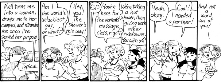 36. I believe it’s been established that subjects of the gender-swap formula maintain their relative orientations; that is, straight guys become straight girls. So Dave may not have any ulterior motives here… she may just really need a massage. (Given what her life is like, that’s pretty understandable.) On the other hand, there were those fresh lip prints on the WWF poster…