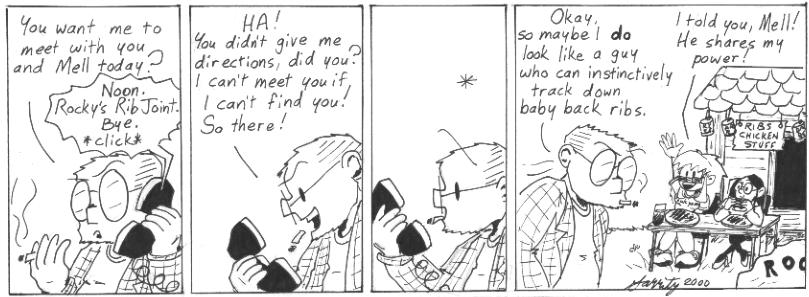 This strip was drawn in crude but loving memory of that night. And I’m very heartened by my inability to find any evidence on the Internet that Rocky’s Rib Joint so much as exists.