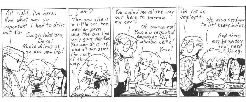 Here it’s established that Helen and Mell don’t own cars, and that Dave’s car ownership is one of the most crucial skills he brings to the lab. The strip is never clear about exactly where the lab is located relative to the characters’ homes (if any), but Helen and Mell generally take the bus everywhere unless they can bum a ride from Dave. Or steal his car, which they also do from time to time. I’ve never owned a car, so I’m writing what I know here. Andrew and I frequently befriend people for their cars.