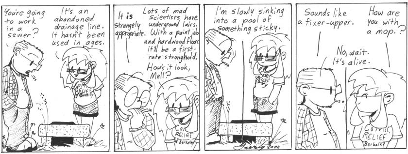 Everybody’s proportions are off again in the last panel, but that’s a pretty accurate reprentation of the storm drains in my suburban neighborhood. We put my brother down one once. It was pretty cool.