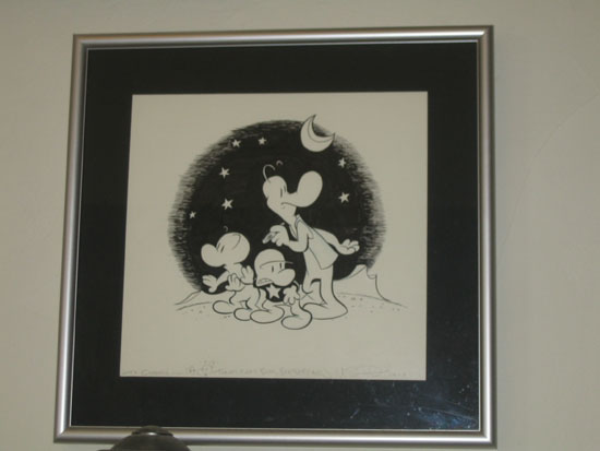 Wow, Dave’s room is a cornicopia of badly-drawn tiny things. On his dresser, he’s got a Darth Maul beanie doll, a pack of cigarettes, the Catbus from the anime My Neighbor Totoro, and Bartleby, the baby rat creature from Jeff Smith’s comic Bone. Except for the cigarettes, these are all items I personally own. I have an attachment to Bartleby because I named him. I won a “Name the Baby Rat Creature” contest in Bone back in the day. For my prize, I received this sketch, which hangs over my bed: