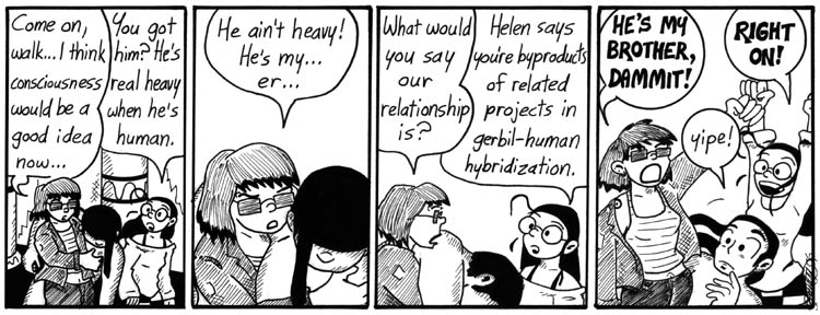 This is one of the strips Andrew really likes. He also likes the one where Madblood’s Theft-Bot grabs Helen’s boob, and the ones with Dana the gerbil riding around in a lobotomized hippie. Make of that what you will.