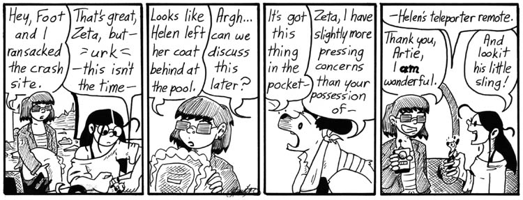 Just so we’re all on the same page, this is the teleporter remote that Mell snagged from the Dave Conspiracy in an off-panel battle that included alligators, a remote originally designed by Dave from the future. Also, Artie’s little sling is adorable.