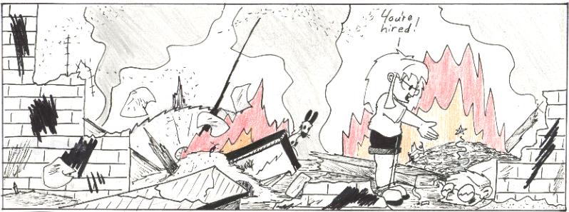 I didn’t do a totally awful job on the debris here. You can see the giant circular blade, and Helen’s desk, and what appears to be a big pile of mulch or something, I don’t know…Okay, it’s not that great. But at least I colored in the fire, so people can tell that’s what it’s supposed to be.