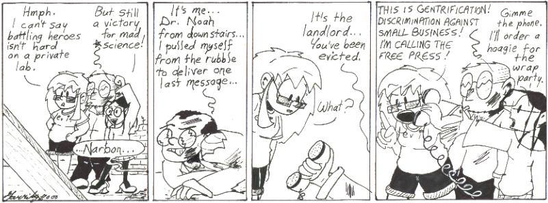 At this point, the look of Narbonic was still very much in flux. I experimented with color a little, but I ended up keeping the strip in black and white, mainly because coloring is hard and I’m lazy. Seriously, I’ve always hated coloring. In second grade I would save my coloring assignments for last because I hated them so much. They’d never get done, and I’d leave them on my desk, and Tara Alsobrook would feel sorry for me and do them for me. That’s how we became friends, in fact. So my hatred of coloring has only bettered my life.