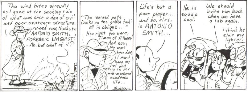 “The air bites shrewdly; it is very cold,” is from Hamlet, Act I, Scene 4. The dialogue in the second panel is aligned funny because I originally included a longer quotation, and then decided to shorten it up. Get to the point, Timon of Athens! (Okay, I changed my mind again. Timon of Athens is actually Shakespeare’s worst play.) “Life’s but a poor player” is, of course, from Macbeth. “I think he stole my lighter” is a very dumb line, but I needed a final punchline.