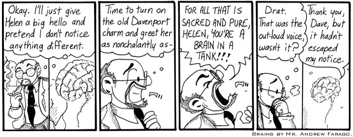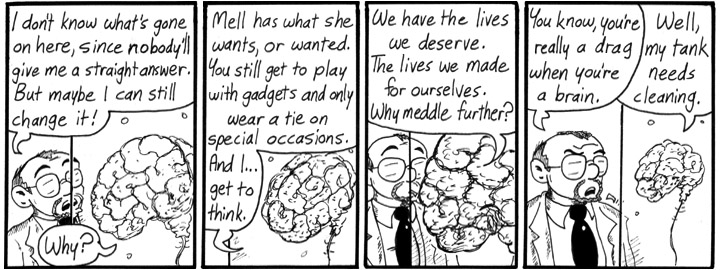 By this point, many readers had already guessed that Future!Helen would turn out to be a brain in a tank. You know why? Because brains in tanks are AWESOME. This is one of the pulp sci-fi tropes I absolutely had to include in Narbonic at some point.