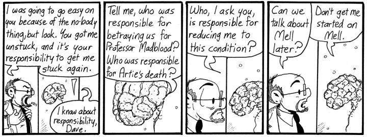 However, I was really bad at drawing brains, so I made Andrew draw Helen’s brain for me. I was worried that if I drew it, people wouldn’t be able to tell what it was, ruining this strip. I should’ve sucked it up and drawn the damn brain myself. A girl has to learn how to draw brains sometime.