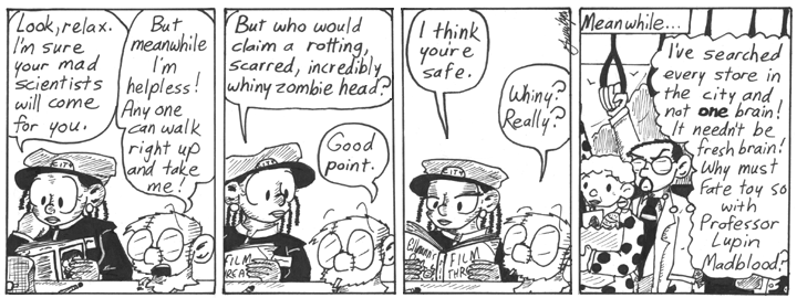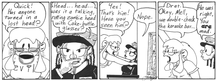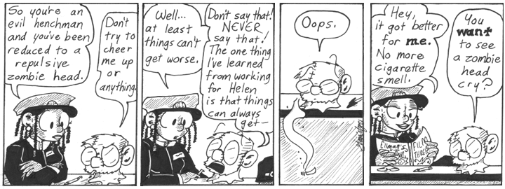 I talk about this in one of the later Sunday installments, but originally I planned to bring this character back. I was going to do a storyline in which she and Dave run into each other at a bar, after Dave has a body and is no longer undead, and end up going on a date. They go miniature golfing. I wrote three or four strips for this storyline but never got very far on it. The real problem was that the Dave/Helen relationship heated up much more quickly than I expected, and soon I passed the point at which this storyline would make narrative sense. Lovelace ended up filling the role of the unfortunate Other Woman.