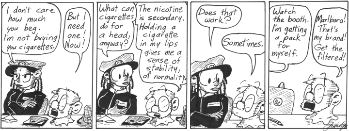 “Watch the booth.” Jeez, what’s with everybody in this webcomic, that they leave various responsibilities to one-foot-tall guys who can barely lift a pencil?
