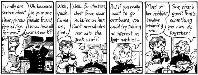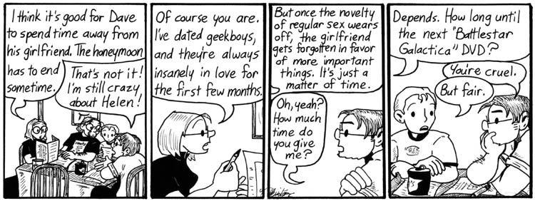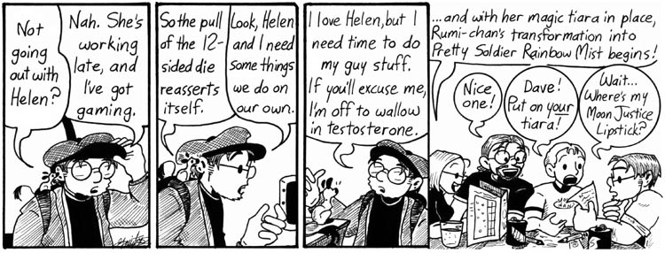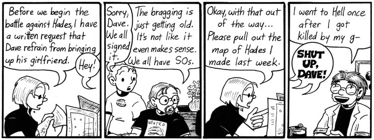 “For the first time, I went to the trouble of having the gaming group sit around a table and drawing it from different angles…”  And it looks GREAT–it always surprises me to look back at earlier strips and see the dramatic difference in style and sophistication of the artwork, since the change is so gradual through time as not to be noticed when I’m reading the serial in order.  This strip seems to my (admittedly untrained) eye to be a really developed and mature piece of work.