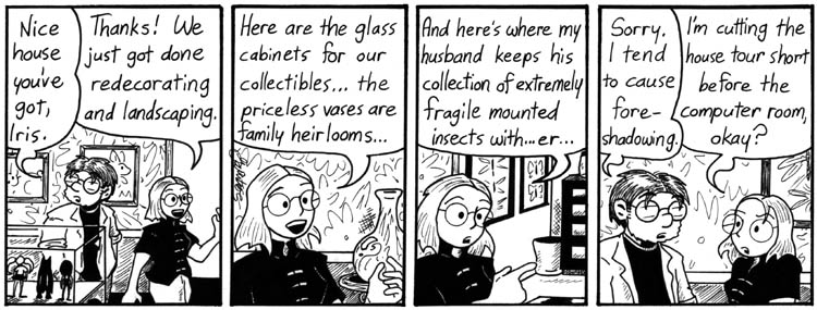 23. /* This strip is supposed to be a setup for horrible destructive things happening to Iris’s house, but not everybody seems to get it. So, um, sorry. Sometimes writing is hard. */Hey, *I* got it. I thought you did fine.