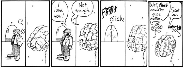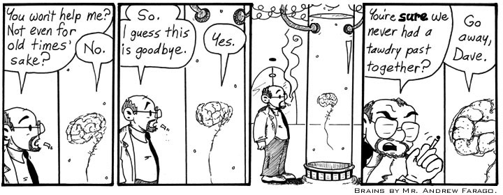 This strip was Andrew’s idea. He asked whether Brain!Helen had little brain personality sprites, so I changed the punchline of this strip at the last minute and pasted in a new final panel. I can’t remember how the last panel originally went.