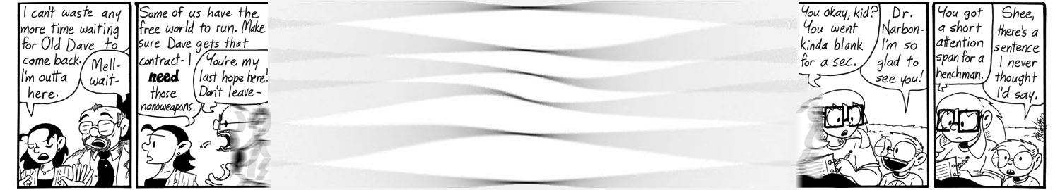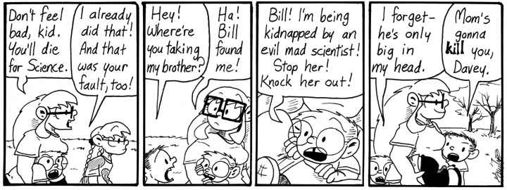 Man, the future strips tend to be pretty dark. I like Little Dave’s giant gap-toothed smile in the third panel, though. Now that I think of it, he kind of reminds me of Conan in the manga Case Closed, which I now edit for Viz. I like little kids in giant glasses.