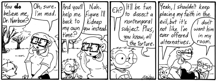 I’m coming to this late tonight, so no time for a sufficient comment. I do have to say, though, that this strip is where Narbonic clicks for me. I mean, this whole arc is the end to the exposition, but this strip is where I finally got that we’re going somewhere more than just gag-a-day, and that it was going to be awesome. Also set up some pretty high expectations, but that worked out all right.