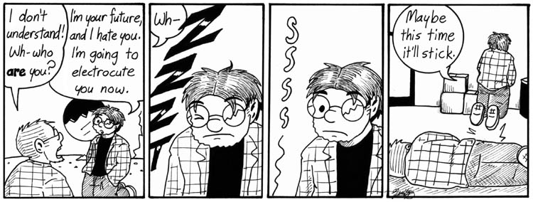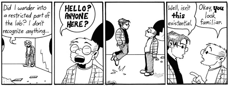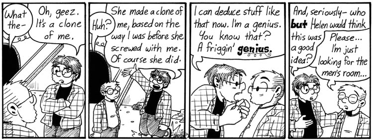 This is possibly the darkest sequence of strips in Narbonic. It was hard to draw. But I couldn’t resist having Dave circa 2000 meet the Dave of six years later, after everything he’s been through at Narbonics Labs. Also, I liked the chance to revisit both character designs. So…yeah, here they are.