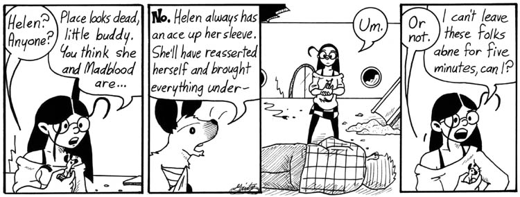 The word-balloon tails in the last panel are confusing. Oh well. At least I drew stacks and boxes of paper in the background, presumably including Madblood’s collection of girlie magazines.