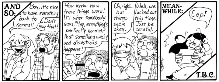 Obviously, the best part of this strip is the collection of weird mutant lab animals in the third panel. Check out the two giant messed-up gerbils in the background! Why didn’t I draw more stuff like this? Oh, right, because it’s hard to keep coming up with new ones.