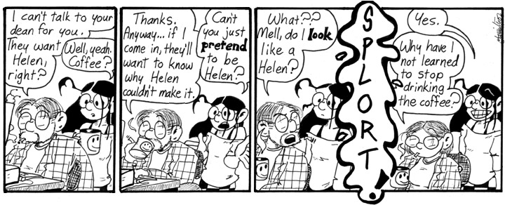 Still gotta love the sound effect for gender-swapping. I can’t remember when I decided on this plot development, although I guess it’s a logical enough way to get Dave to Mell’s campus instead of Helen. Helen spent a very long period of time male during the D-Con arc, so I might as well turn Dave into a girl for a while.