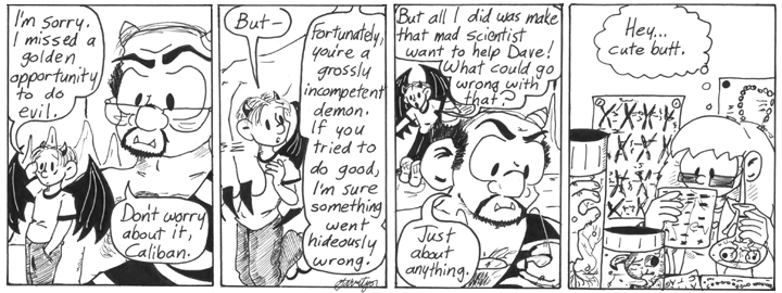 This strip is awesome, I don’t care what you say. The last line is a nod to General Protection Fault, which unfortunately doesn’t have so much of the cheerful ogling anymore. If this strip had been drawn many years later, the hand in the jar could’ve been a Doctor Who reference.