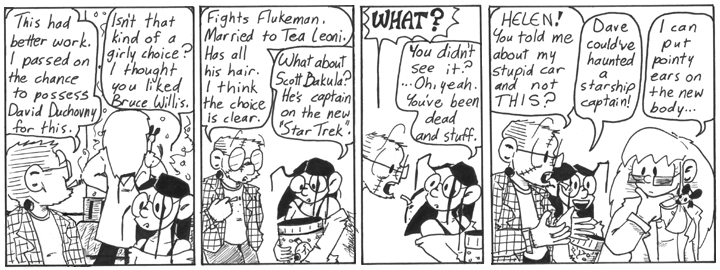 Tuesday’s Comic: Ah, I remember this episode well. I never did figure out if Helen was literally enticed by a dead insect, or if said insect was a strange metaphor for Dave. O’well. Works both ways. (And if the last line is meant to call forth a memory, one would think that memory would be Dr. Narbon.)