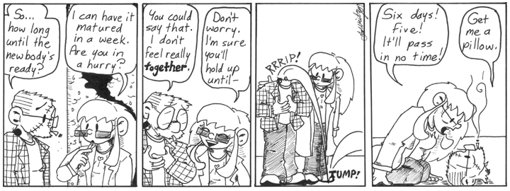 Eh, this strip is kinda lame. Sometimes you just need a sixth strip to fill out the week, y’know? The one good part is the unidentified organ in a jar Mell is toting around for no particular reason. Also, Mell seems to be aware of Dave’s man-crush on Bruce Willis from the Sunday strips. It’s always weird when Sunday Narbonic crosses over with regular Narbonic.