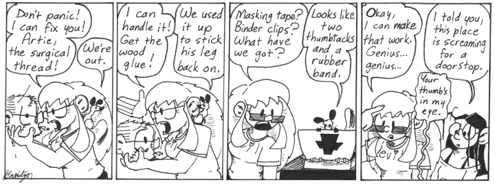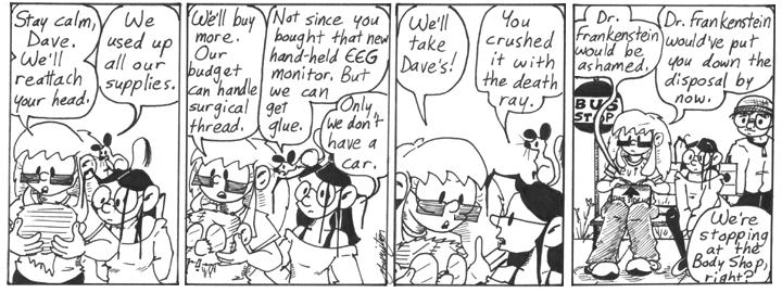 As you may recall, in a previous strip Artie mentioned being unable to lift Helen’s EEG monitor. Now we learn that Helen has remedied the situation. This was in response to online discussion about why Helen would have some huge primitive EEG monitor too big for a gerbil to lift. I can be easily swayed by criticism sometimes. Other times, I’m just too lazy to fix stuff.