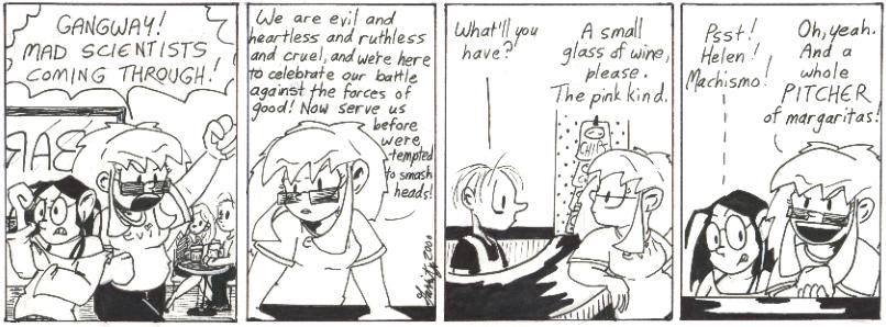 I like the strips that allude to some larger organization apparently in charge of monitoring and encouraging cliche mad-scientist behavior. It’s even better if no real explanation is given for the vague references to grants and stuff. I kind of wish I hadn’t eventually needed to set up concrete institutions like the Mad Science Symposium.