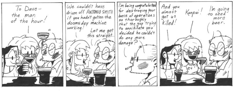 And the first Narbonic storyline ends, not with a bang, but with a whimper and a cliffhanger. Unless you consider “New Digs” part of the opening storyline, in which case it ends with Dave starting work.
