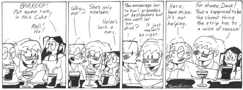10. I agree with Michael that Thursday’s(?) strip wasn’t cuttable. It is a worthy addition, not only establishing Mell’s age, but giving Helen some character development, acknowledging Dave’s place in the social dynamic, and breaking the fourth wall. What more could a strip entry need?